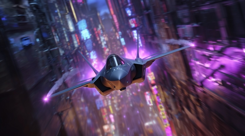 "positivePrompt": "Futuristic stealth jet streaking through a neon-lit cityscape with glowing purple exhaust",